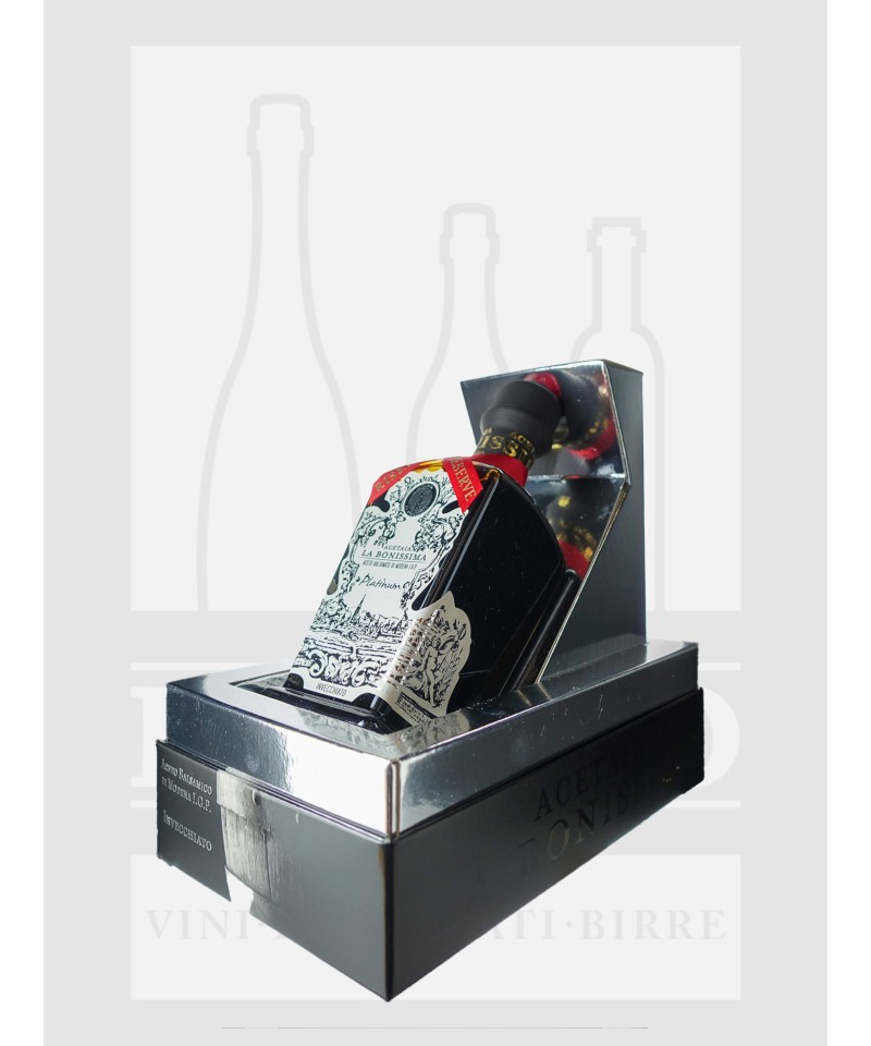 L’Aceto Balsamico di Modena IGP Platinum di Acetaia La Bonissima rappresenta il vertice della linea “Le Preziose”. Ricavato da mosti cotti selezionati e affinato a lungo in botti di rovere, si distingue per la sua densità importante, il colore bruno profondo e la straordinaria complessità aromatica. Al naso offre sentori intensi e armonici, con note di frutta matura e legno. Al palato è avvolgente, vellutato e persistente, con un perfetto bilanciamento tra dolce e agro.