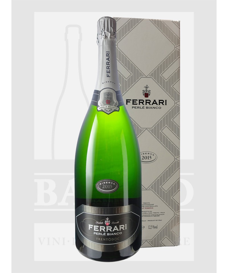 l Ferrari Perlé Bianco 2015 Magnum è una riserva millesimata di sola uva Chardonnay, selezionata nei vigneti di alta quota del Trentino. Un metodo classico di grande purezza ed eleganza, espressione del savoir-faire Ferrari nel lavorare esclusivamente il vitigno bianco più nobile al mondo. Dopo oltre 7 anni di affinamento sui lieviti, il vino svela un profilo aromatico fine e luminoso: agrumi maturi, fiori bianchi, nocciola e leggere tostature si fondono con una mineralità vibrante. In formato magnum e custodito in astuccio, è ideale per celebrazioni importanti o per chi cerca una bollicina da meditazione, ampia e rigorosa al tempo stesso.