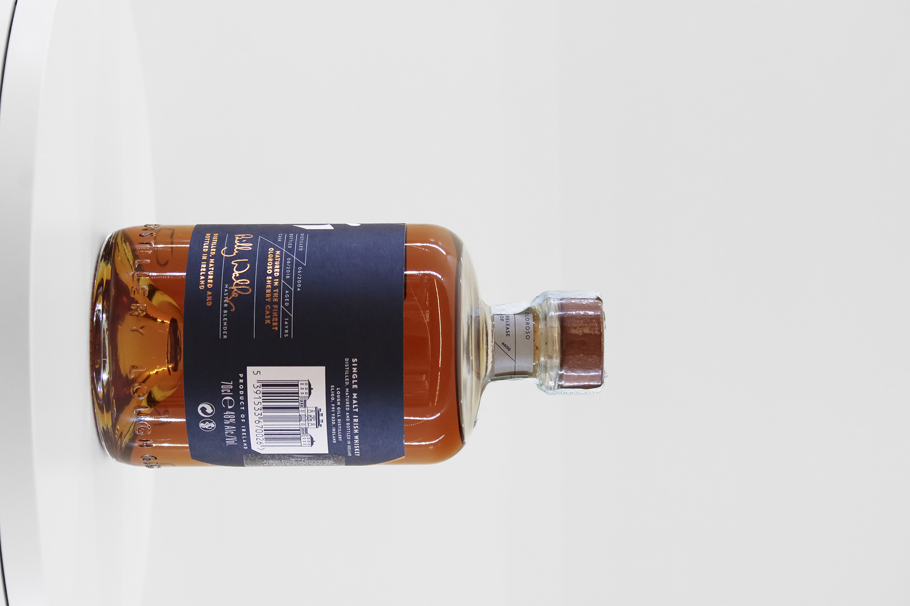 Bottiglia da 700 ml con design elegante e moderno: etichetta blu notte impreziosita da una rosa dei venti stilizzata in oro, simbolo di esplorazione e direzione, perfettamente in linea con la narrazione mitologica della serie. Sul vetro è inciso LOUGH GILL DISTILLERY a rilievo, segno distintivo di artigianalità.